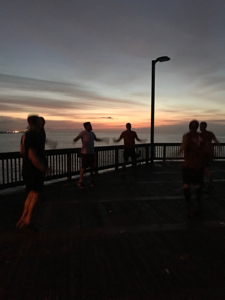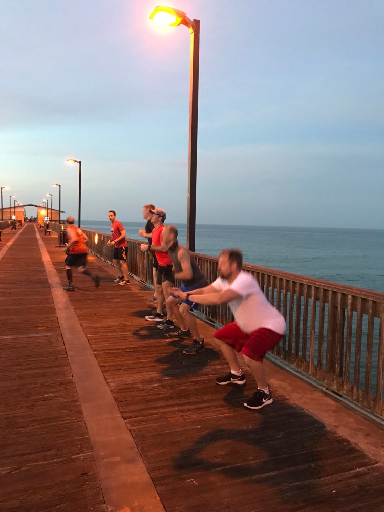 Thang 1- well, I thought I had a good idea. Split up in three groups, and we have one group relieve another, hopscotching all the way to the beginning of the pier. Well, I still don’t know how I messed it up, but one group did 5 burpees, then was supposed to relieve another group doing dips, then they relieve the last group doing incline Merkins. Basically we dodged fishermen while KV tried to explain how I fucked it all up.