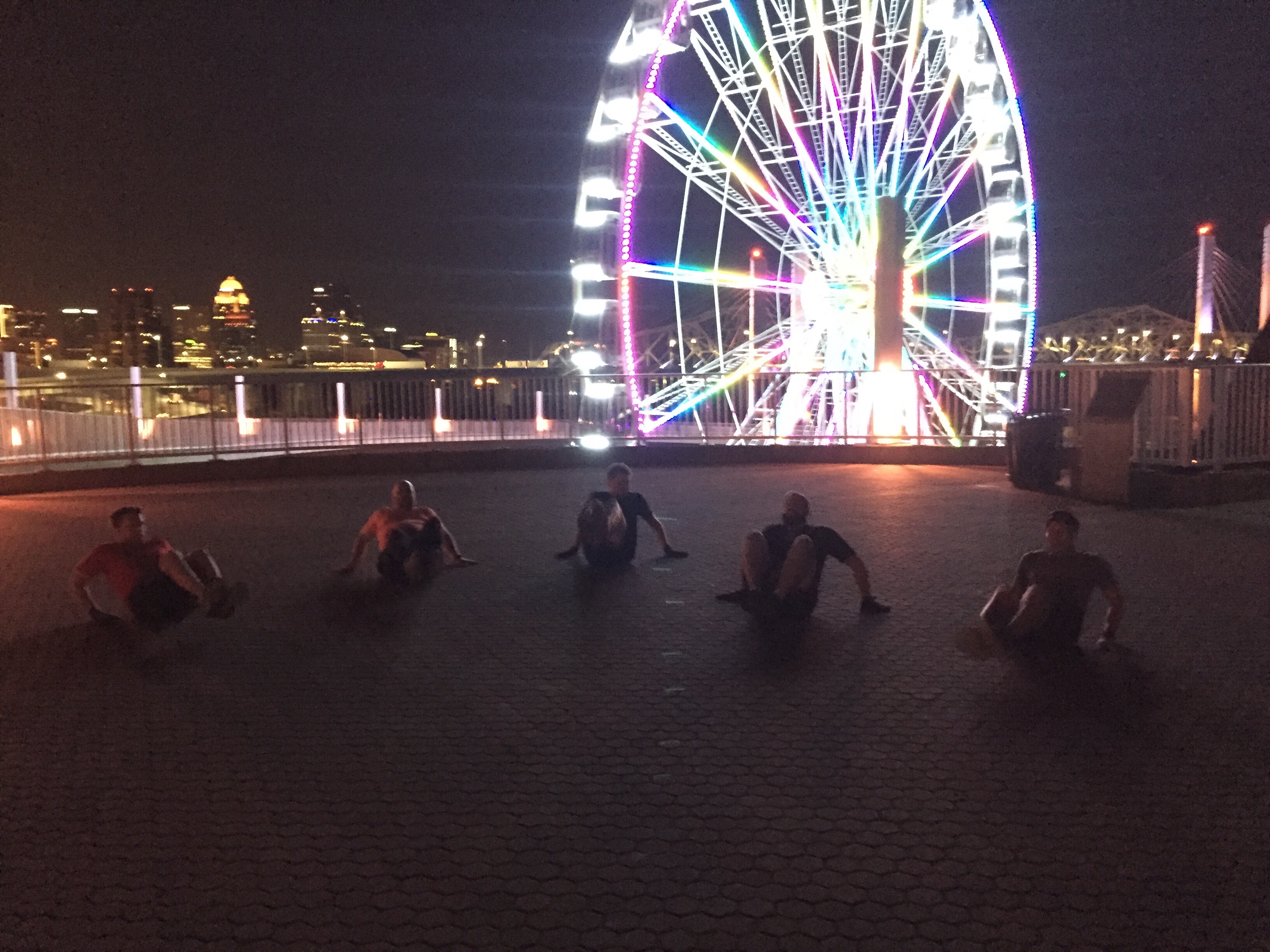 A couple of weeks ago I was thinking, we haven’t had a Black Ops down at the Big 4 Bridge in a while so I threw it on the calendar. It’s really a cool place to workout aside from the evening shootings and such. After seeing that on the news, I was like if anyone is going to be doing some murdering down here, it better be OJ. However, no chance of danger at 5:30 in the AMs so all good. Plus I wanted to see the ferris wheel up close.