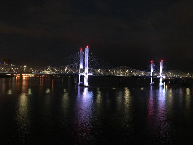 AO looks cool with the bridge lit up in the background. HIM excited to hear that we would be doing exercises during the ruck, not really. Oh well get to steppin. Over the bridge we go. Some while walking ruck curls and overhead presses. Around Indiana we roam. Found the stairs back up to the bridge, there’s a lot of dang stairs.
