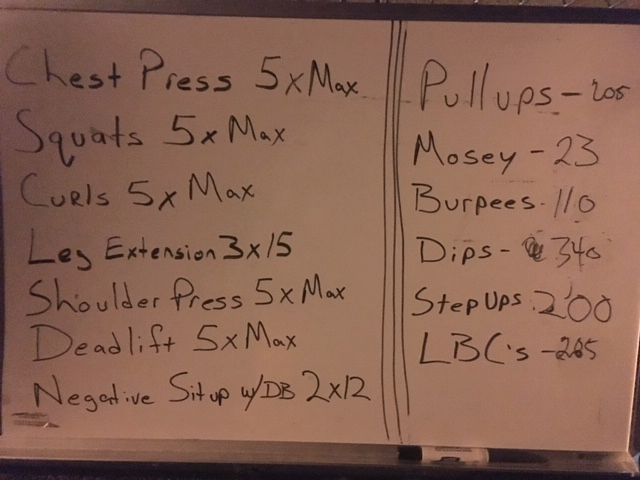 What a fantastic morning to be out in the gloom. This workout keep me busy last week at my gym, so I modified a few thing but the general purpose was the same. Work through the list on the left (Chest Press, Squats, Curls, Leg Extensions, Shoulder Press, Deadlift, Negative Situp with a Dumbbell) do 5 sets of each until failure. In between each set, pick an exercise on the right and do as many reps as you want then tally on the board as a group. Most impressive to the Q – Pullups with 205 and dips at 340, plus everyone did a few burpees.