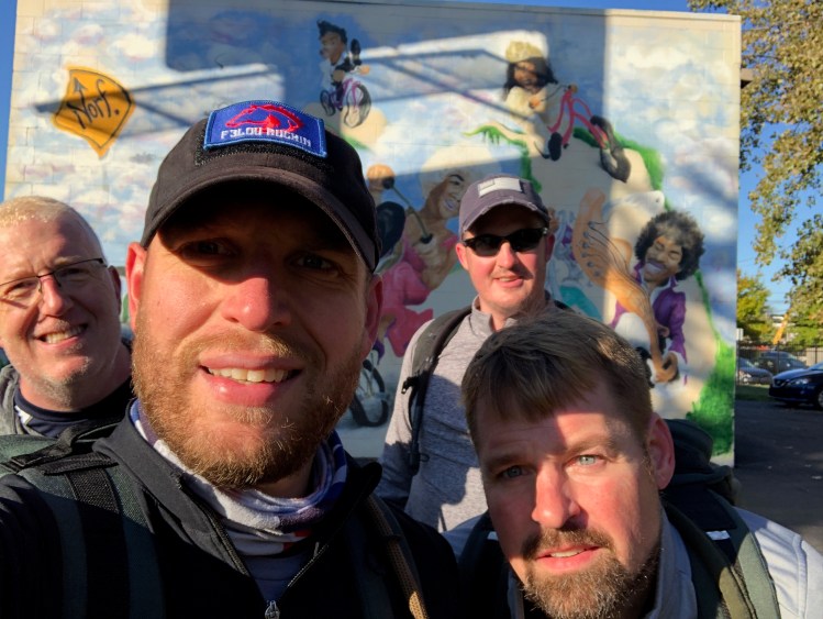 On to the next, after a little foot Maintenence and nutrition. A common theme echoed, drink water. Dehydration is often underestimated in the cold. On to the next, it’s starting to get real. Refreshed by maint. The third long leg went fairly fast to the We travel on, a little slower… Now we were venturing west of downtown, where we walked past a man starting 2 smokers under a canopy with signs for meal in a cup BBQ. Damn that sounded good! I only wish we had past him after he had some food ready. Found it “Ride Norf” Mural (1.2mi)