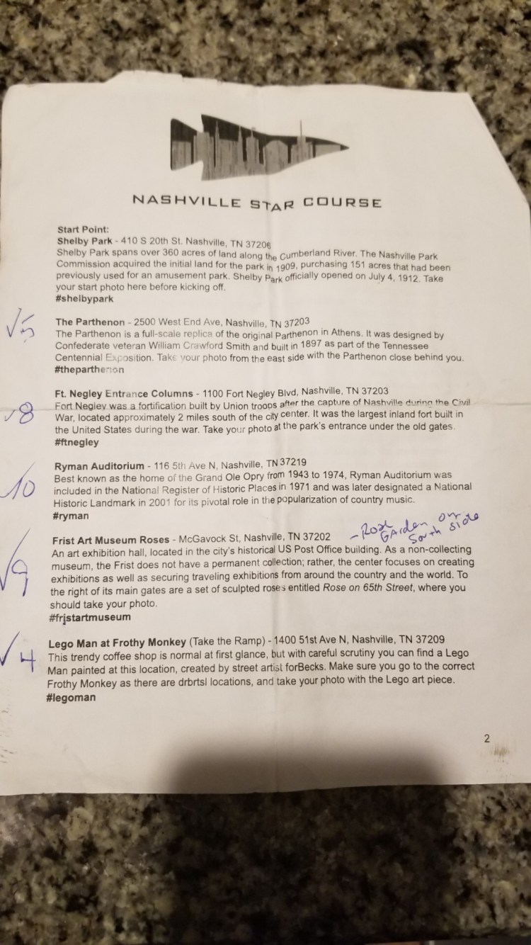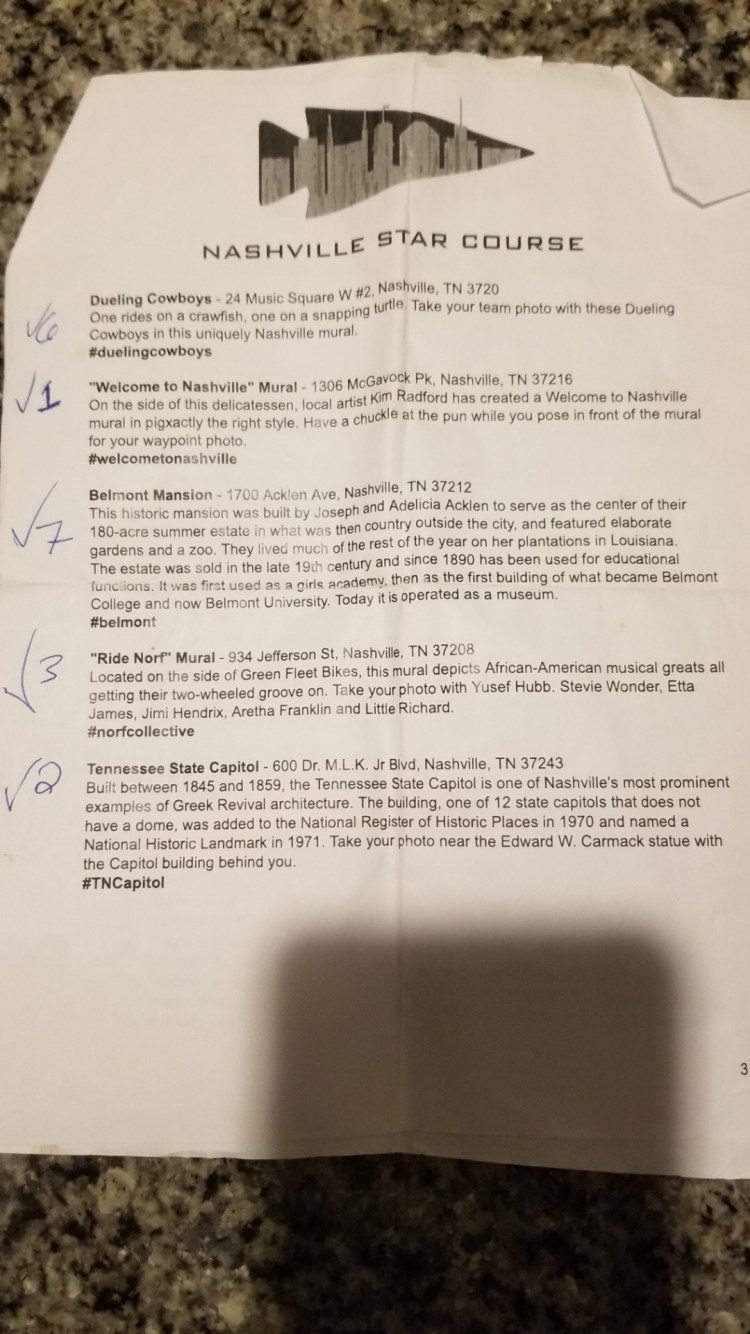 The distance between points seems to be getting shorter as we stay near Downtown Nashville. It’s a good thing too, It’s helping Moral to check off the points. Somewhere in this section Brian injured his knee. He was hobbling quite a bit and it looked painful. Then we made it to Belmont University.