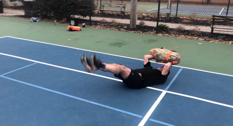 Holy Roller used a heavy vest for his ruck part, and kept impeccable form on his movements. It was a sight to see. Here’s HR holding plank for some weighted pull throughs: