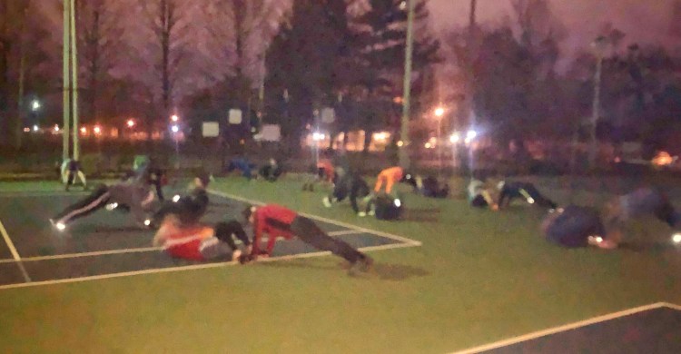 PAX then ran from LCA to the tennis courts. Split into 4 groups. 2 minute all you got work. Corner 1 for AMRAP lunges; Corner 2 for AMRAP squats; Corner 3 for AMRAP flutter kicks; Corner 4 for T-Merkins. (According to mumblechatter reports, the T Merkins on the cold tennis courts left an impression on certain members.) After two minutes, the groups ran to next corner for the next set. All groups completed all 4 sets.