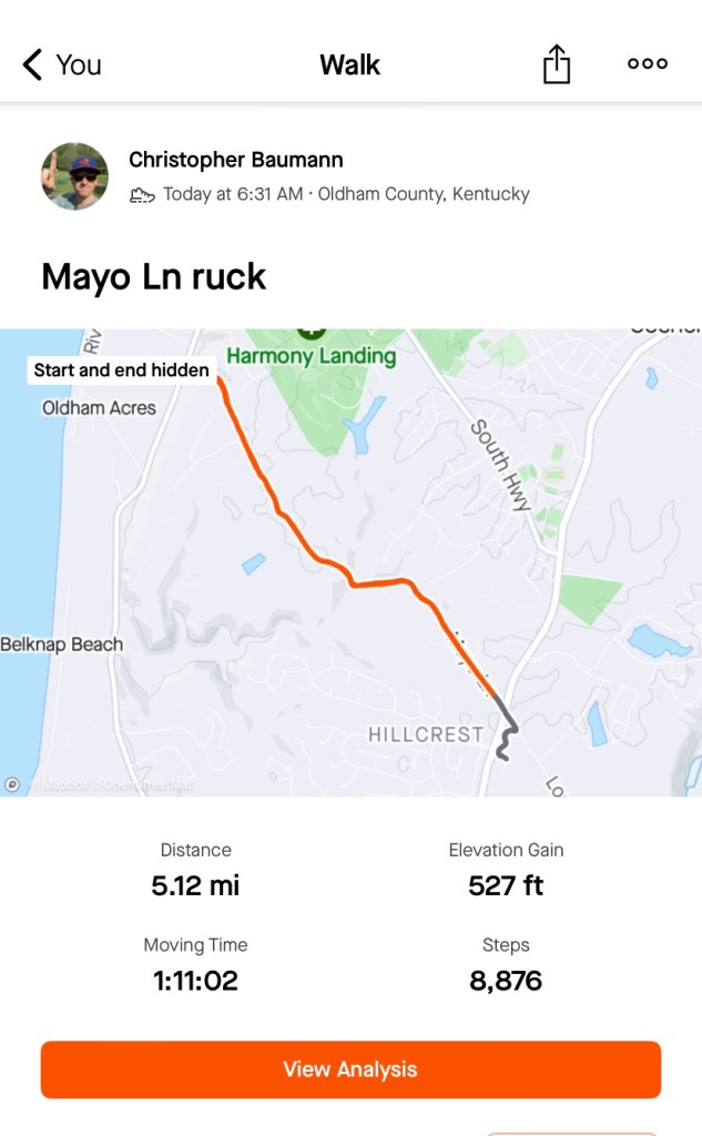 Rucked Mayo Ln… round trip… smacked the stop sign 🛑 at the half way point. Upon return went back out to pick up the 6. Finished with cadence abs, plank, & merkins on my MF down.