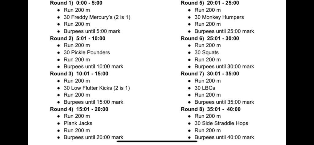 8 rounds x 5 min/round = 40 minutes total. Each round with a buy-in, then AMRAP burpees until the 5 minutes is up. Keep track of your cumulative number of burpees for the 8 rounds. You vs. you.