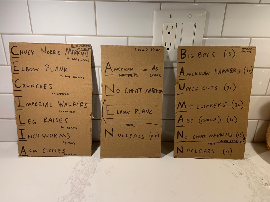 Station 1… CECILIA… 60 seconds each letter exercise and then short mosey lap (alternated side shuffles & moseys) after each letter.