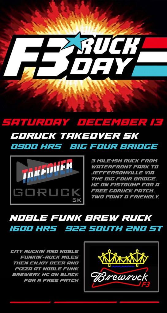 F3 Ruck Day Tomorrow! Posted bylukesharrettDecember 12, 2025Posted in#Louisville Share this:Share Share on X (Opens in new window) X Share on Facebook (Opens in new window) Facebook Email a link to a friend (Opens in new window) Email Share on WhatsApp (Opens in new window) WhatsApp Like Loading...